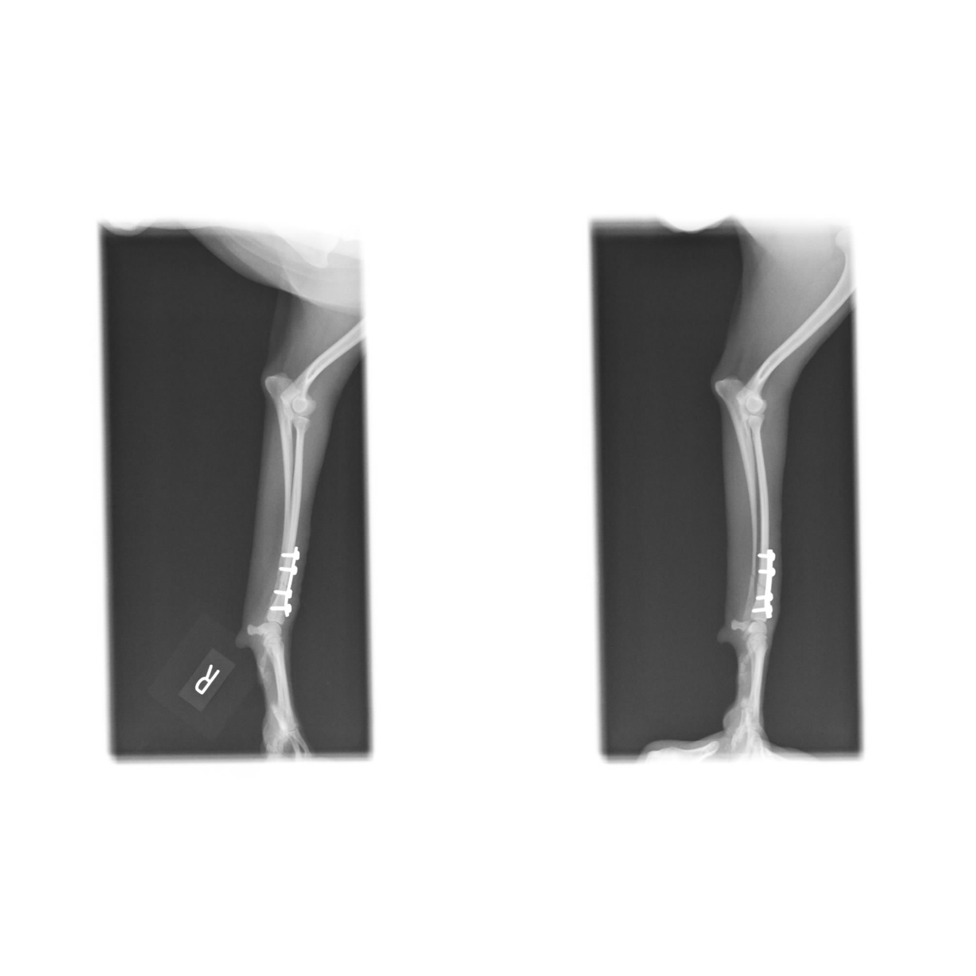 骨折の治療法には多種多様の方法がありますが、超小型犬の前足の骨折で最も多用され、キレイに治せる治療法はプレートを用いた内固定です。