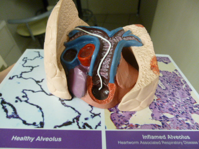 肺動脈のフィラリア(白いそうめん様のもの)の模型。